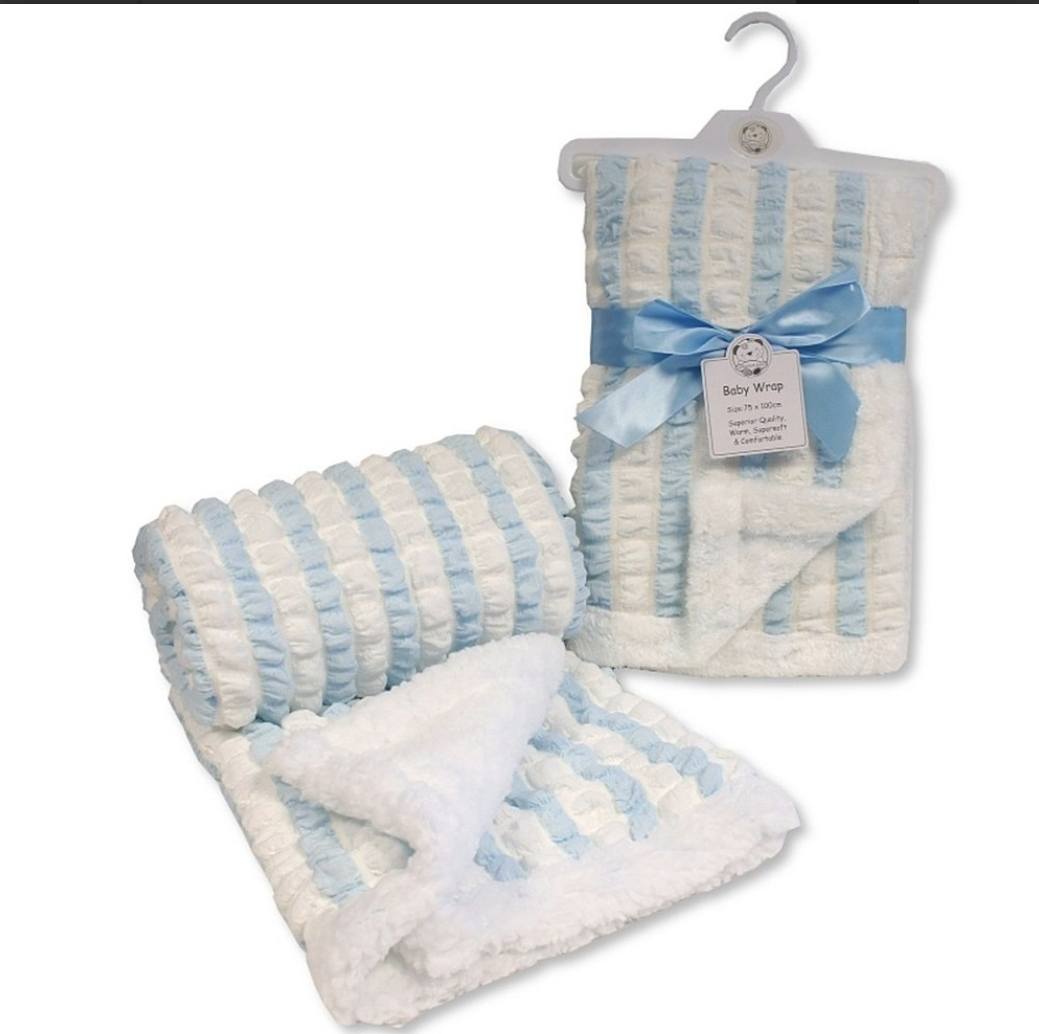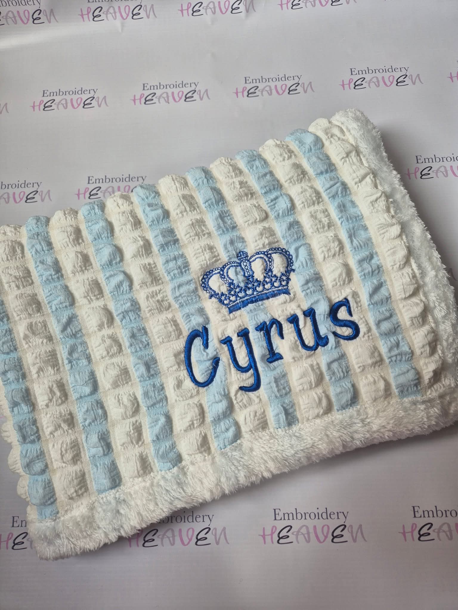 Wrap your little one in comfort with this beautifully crafted blue and white patterned blanket. Featuring a soft, fluffy backing for added warmth and coziness, this blanket is perfect for snuggles, naps, and special keepsake moments.