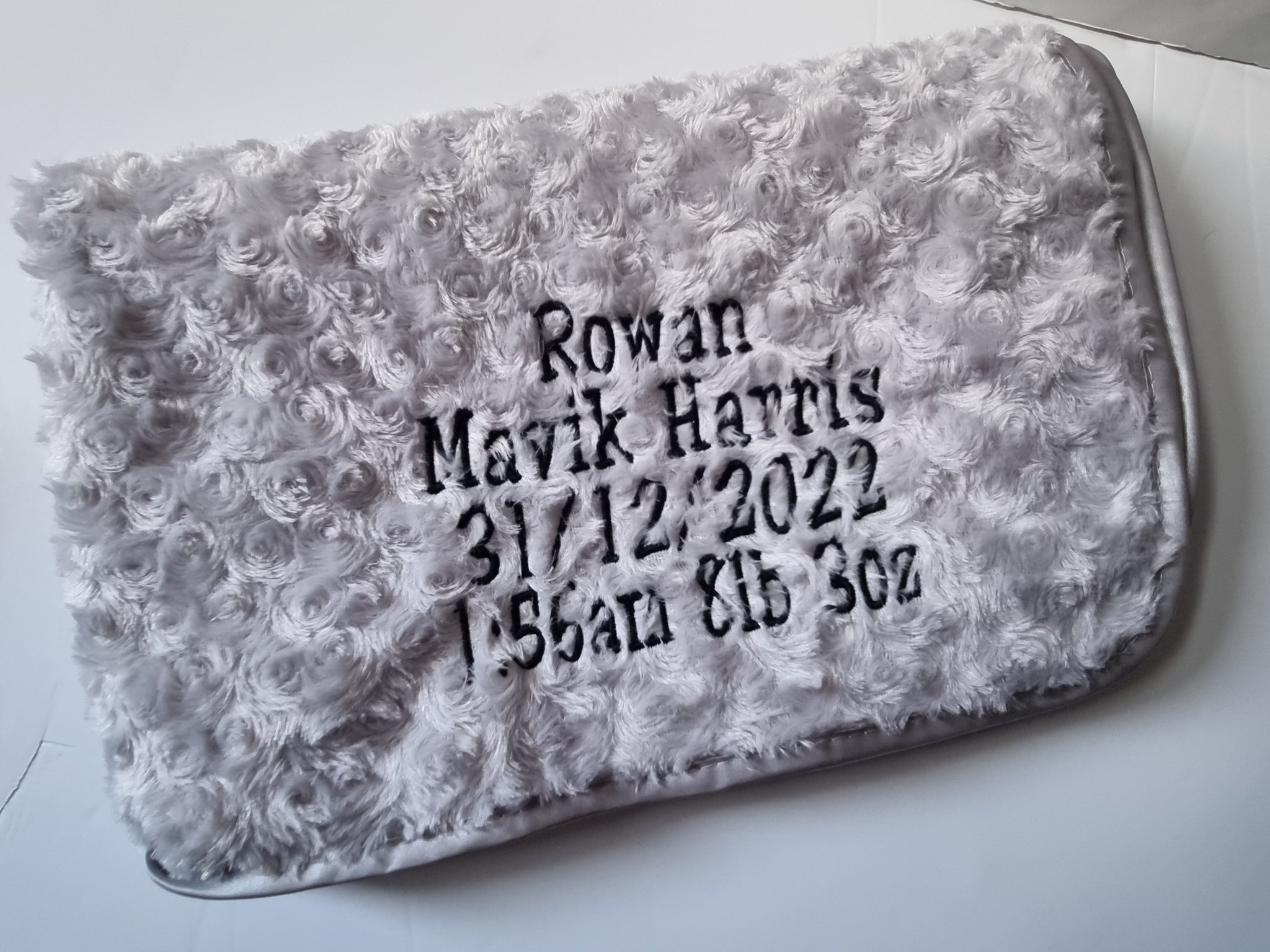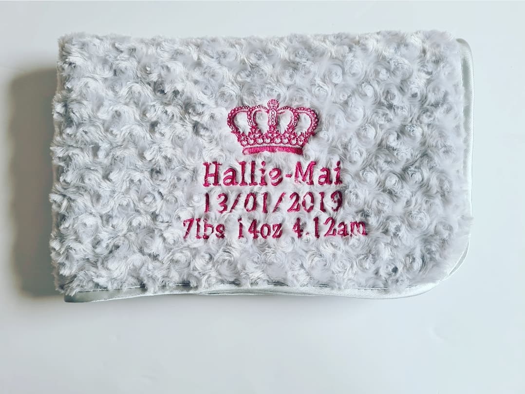 This listing includes custom embroidery of a name and birth details (e.g., date, time, weight) or a short personalised message, all neatly stitched in the corner of the blanket.