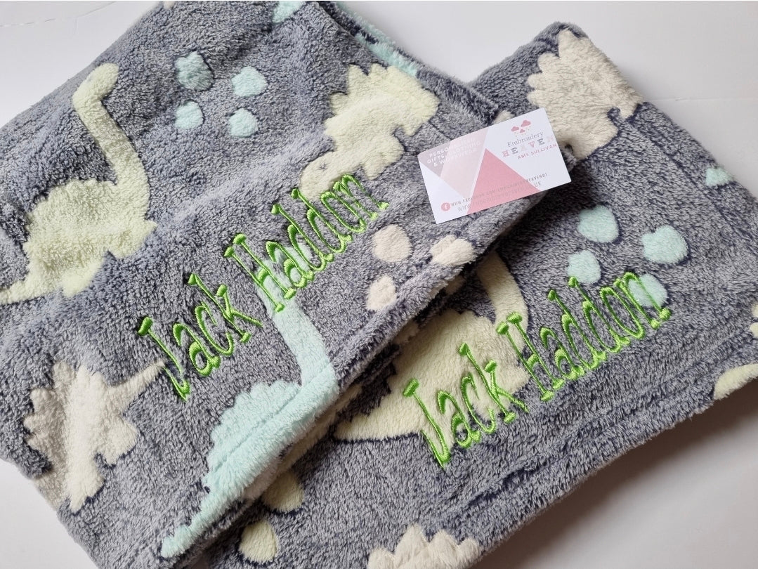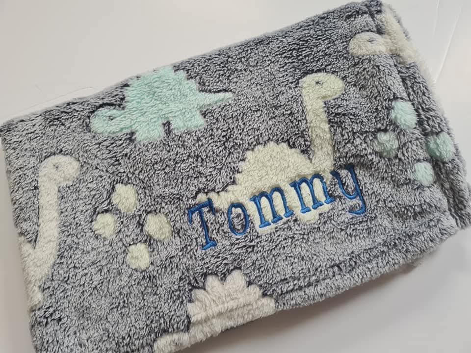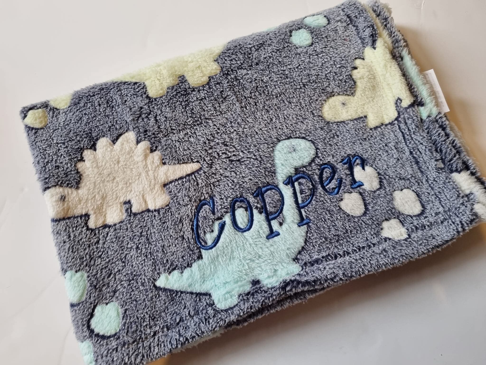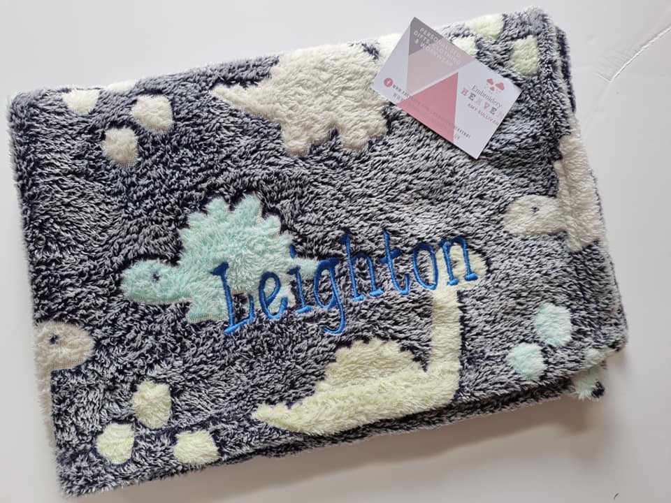 This soft and cozy blanket features a playful dinosaur pattern, personalised with embroidery in the bottom corner.
